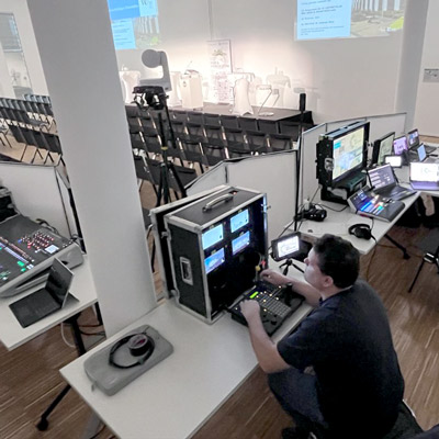 Bis zu 6 Kameras gleichzeitig. PTZ-Steuerung, Close-Ups und Totalen – alles live gemischt. Für Kongresse, Konferenzen und Presseevents.